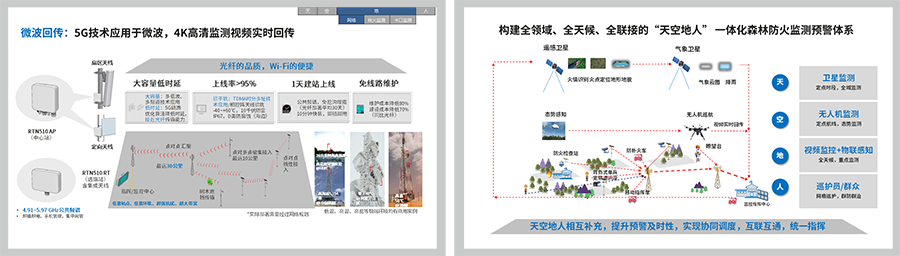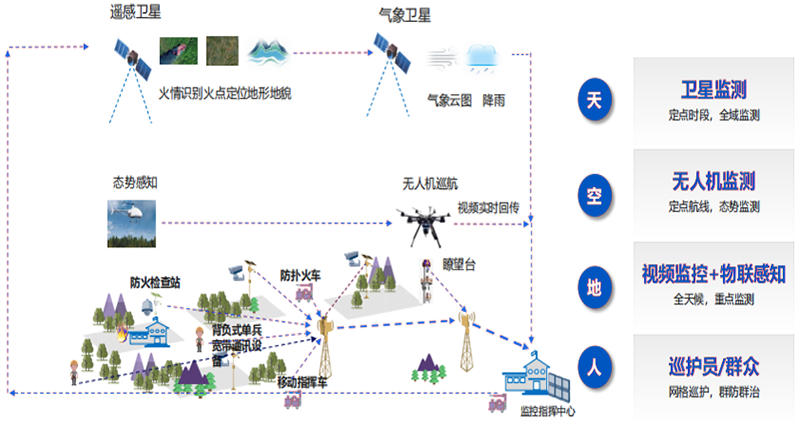 通过人员巡护、视频监控、无人机监测、卫星监测的全方位防火体系建设,打造全领域、全天候、全联接的“天空地人”一体化森林防火监测预警解决方案。天空地人相互补充,提升预警的及时性,实现协同调度,互联互通、统一指挥。此外,通过抱杆、挂墙等方式进行灵活安装,实现 “零机房”建网,降低网络建设成本,缩短网络部署周期。