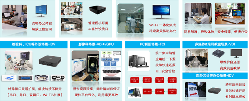通过融合IDV(智能桌面虚拟化)、VDI(虚拟桌面基础架构)以及TCI(透明计算基础架构)三种云桌面技术架构,为医院搭建一套基于云服务的虚拟化办公及管理平台,帮助医院信息中心解决新一代PC因无法支持XP或Win7而与现有HIS等业务系统无法兼容的问题,协助医院信息中心实现新业务系统的快速部署及上线,提高日常系统蓝屏等软件故障的处理效率,降低终端整体运维成本,提升临床科室对信息中心的服务满意度。