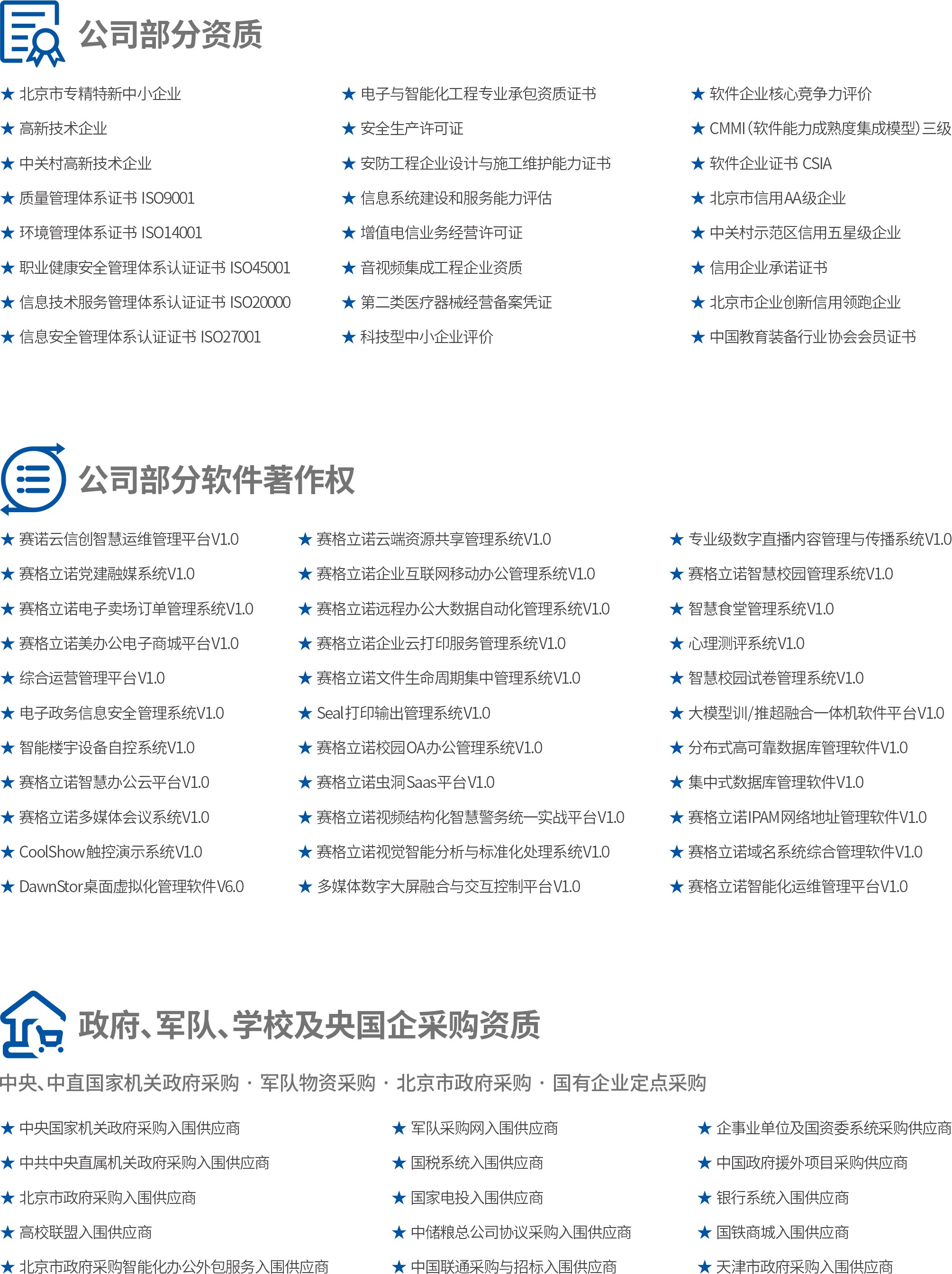 赛格立诺作为北京市专精特新中小企业、高新技术企业、中关村高新技术企业,凭借多年累积的行业经验与多样化的产品,已获得多项国家体系认证及多项软件著作,并连续多年获得中央国家机关政府采购、中直机关单位政府采购、北京市政府采购、国资委企业、军队、金融、通信、医疗等行业采购协议供货商资质。