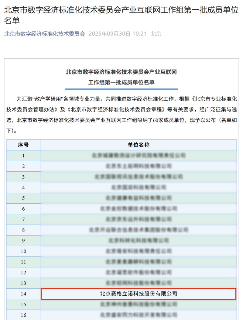 为汇聚“政产学研用”各领域专业力量,共同推进数字经济标准化工作,根据《北京市专业标准化技术委员会管理办法》及《北京市数字经济标准化技术委员会章程》等有关要求。近日,经北京市数字经济标准化技术委员会严格评审,北京赛格立诺科技股份有限公司(以下简称“赛格立诺”)正式获批成为其产业互联网工作组成员单位,加入工作组标志着赛格立诺在产业互联网领域的技术实力、实践成果和标准化建设能力获得了权威认可,未来将深度参与北京市数字经济,特别是产业互联网相关标准的研制、修订与推广工作。
