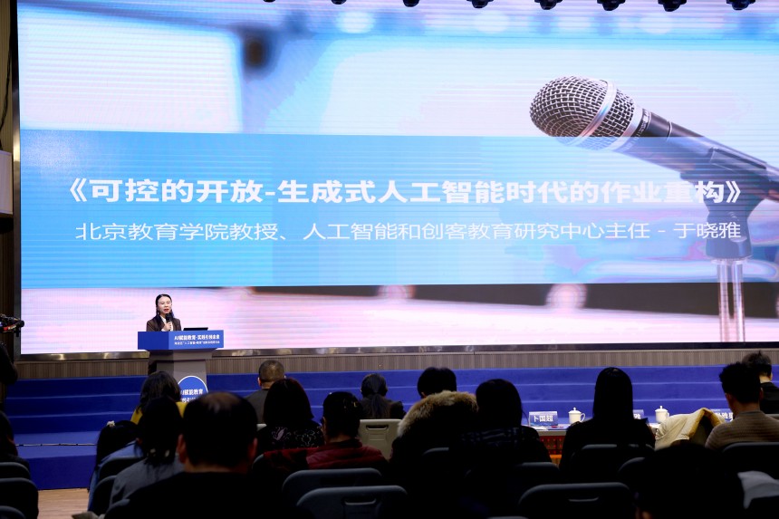 专家讲座环节中,北京教育学院教授、人工智能和创客教育研究中心主任于晓雅以《可控的开放-生成式人工智能时代的作业重构》为题,从理论高度剖析了AI时代教育面临的挑战与转型路径。面对AI带来的认知变革,教育不应一味“封堵”,而应构建“可控开放”的教学新模式,通过从结果评估转向过程评估、从标准答案转向真实世界复杂约束、从技术防范转向人机协作能力考核三大维度,重构作业与考试形态。于晓雅强调,教师应从“教书匠”转型为 “认知设计师”,学生需建立人机共存的新共识与新道德,让 AI 真正成为赋能成长的基础设施。