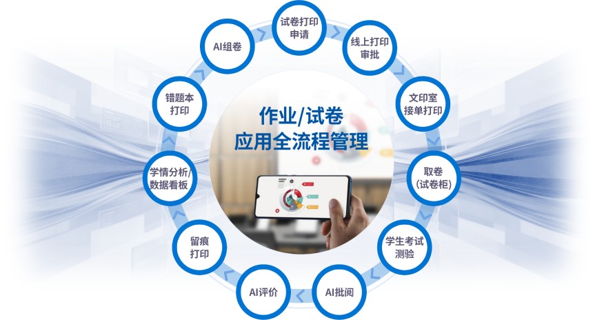 从数据采集、AI 批阅、学情分析到错题留痕打印、校本题库沉淀、AI组卷,形成全流程闭环,实现“一生一辅、一生一卷"”精准教学,既为师生双减,又降低20%~30%文印成本。